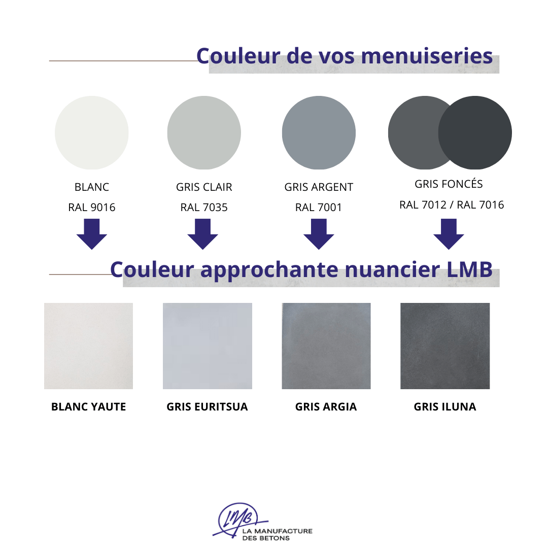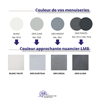 - Possibilité de toutes les couleurs référencées par le nuancier Mérillon
