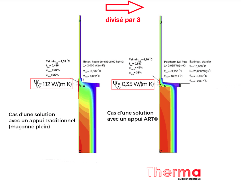 En ayant développé la technologie ART (Appuis à Rupture de pont Thermique) cela garanti un pont thermique divisé par 3. C’est à dire qu’il permet de réduire les déperditions thermiques de votre bâtiment…Autrement dit il est 3 fois plus isolant qu’un appui d’ouverture standard.